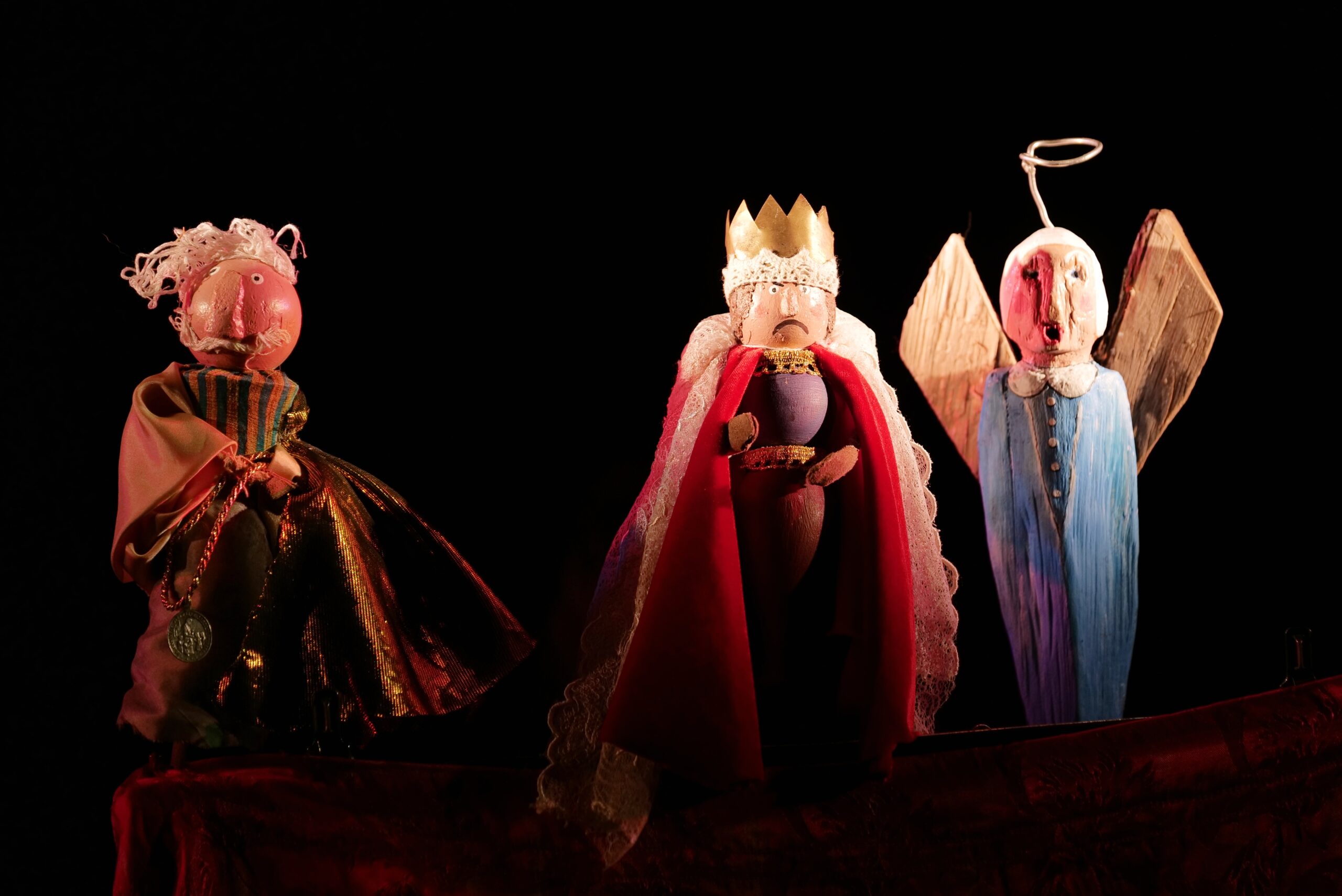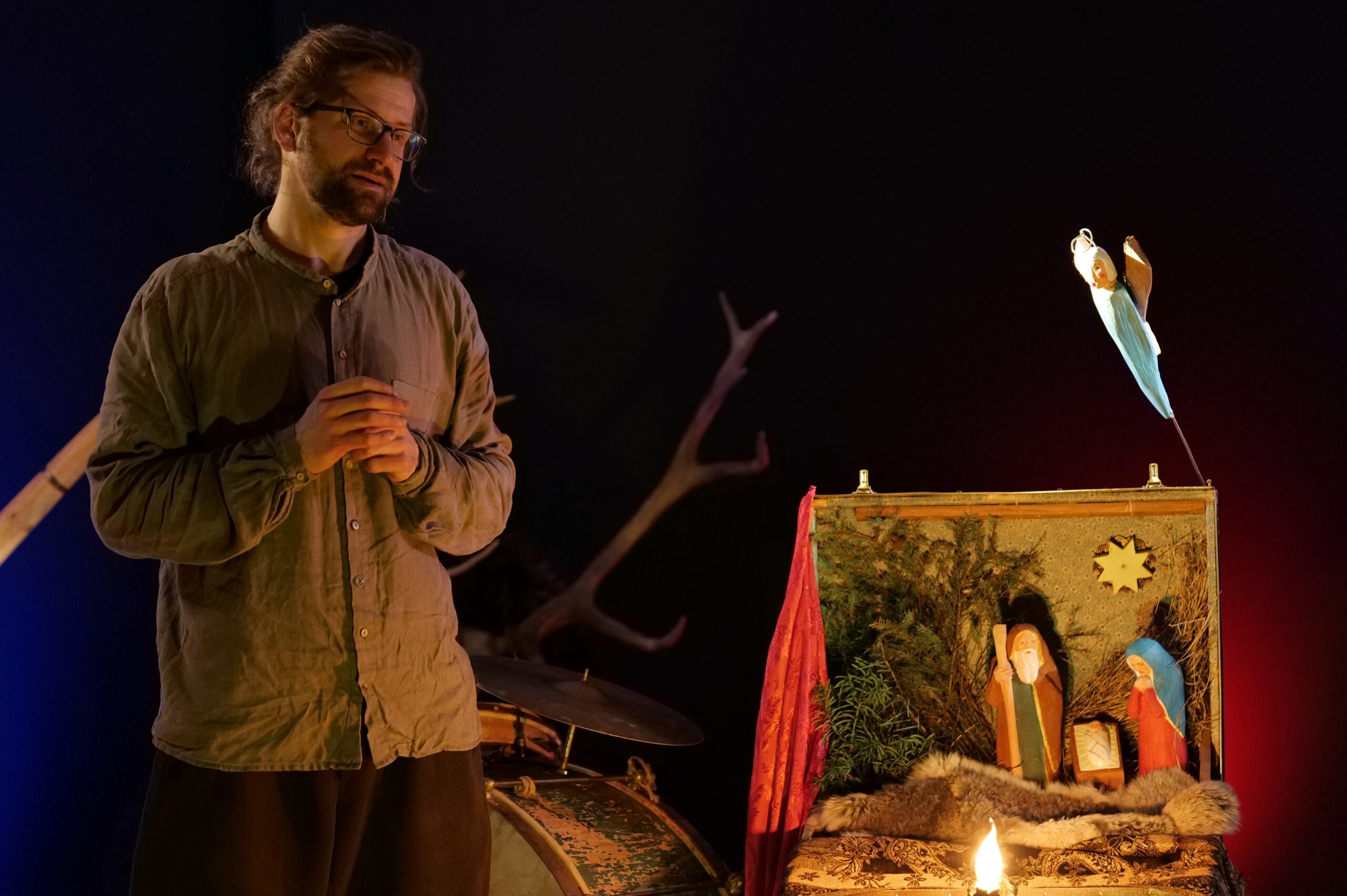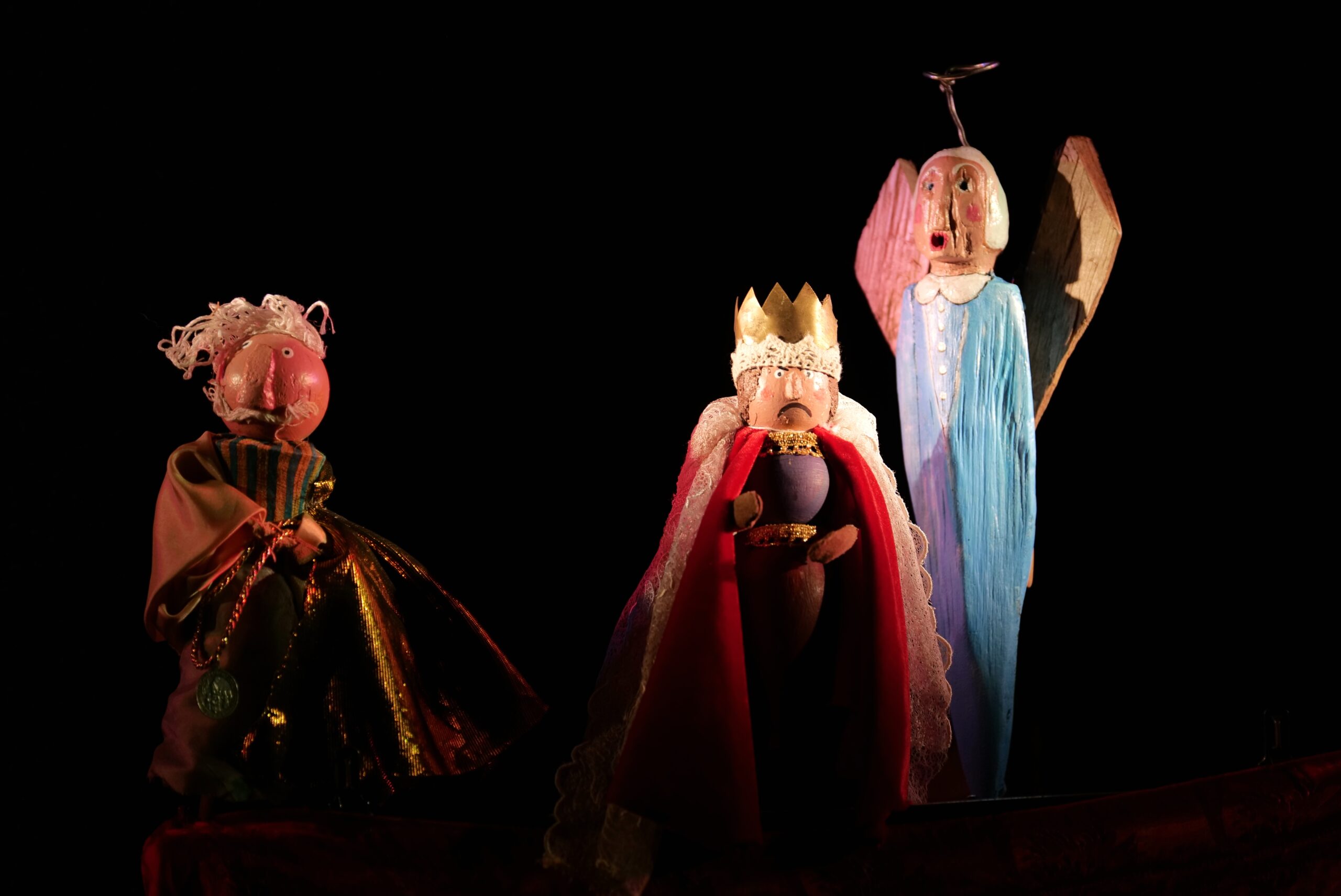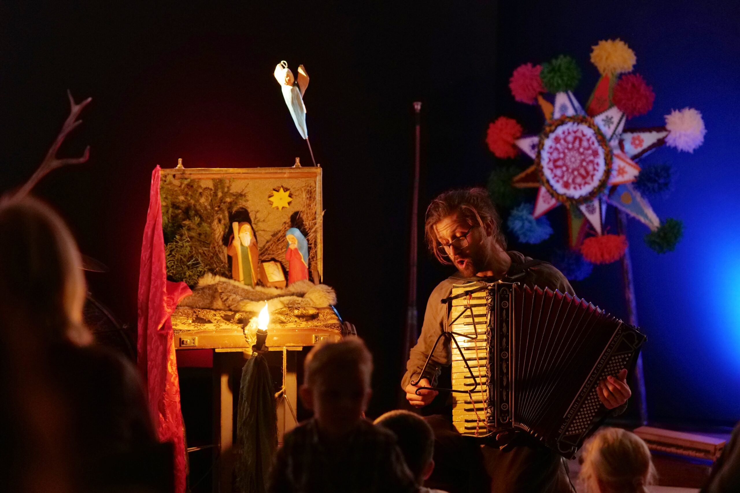 Artyści własnoręcznie wykonali lalki do spektaklu. Powstały ze starych przedmiotów oraz naturalnych materiałów gromadzonych przez twórców od lat. Muzyka w spektaklu wykonywana jest na żywo na tradycyjnych instrumentach: na scenie słychać dźwięki przedwojennego akordeonu, bębenka obręczowego, ręcznie kutego trójkąta oraz różnego rodzaju instrumentów perkusyjnych. Dopełniają je starodawne kantyczki i polskie kolędy śpiewane przez Mateusza Tymurę – aktora i muzykanta.