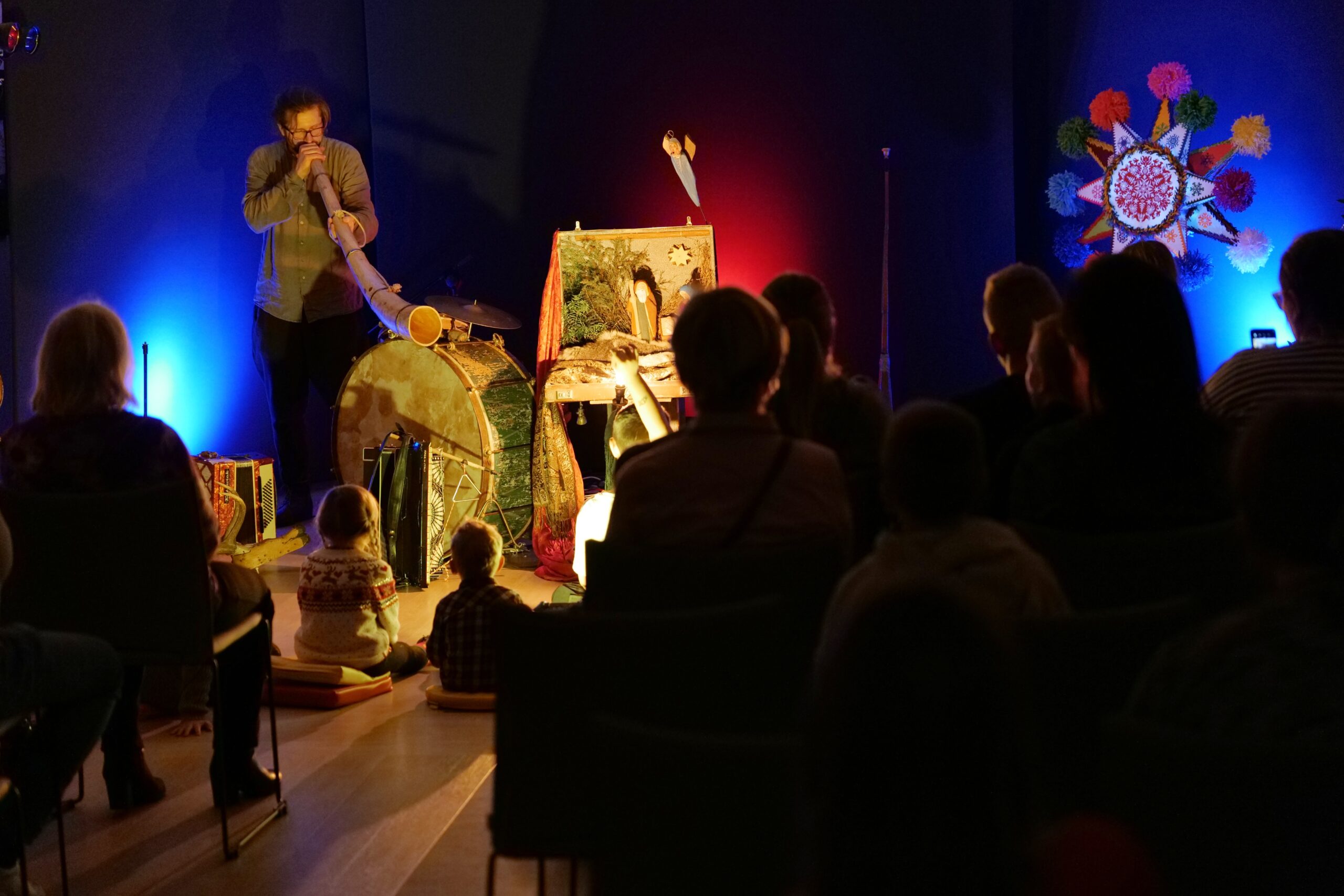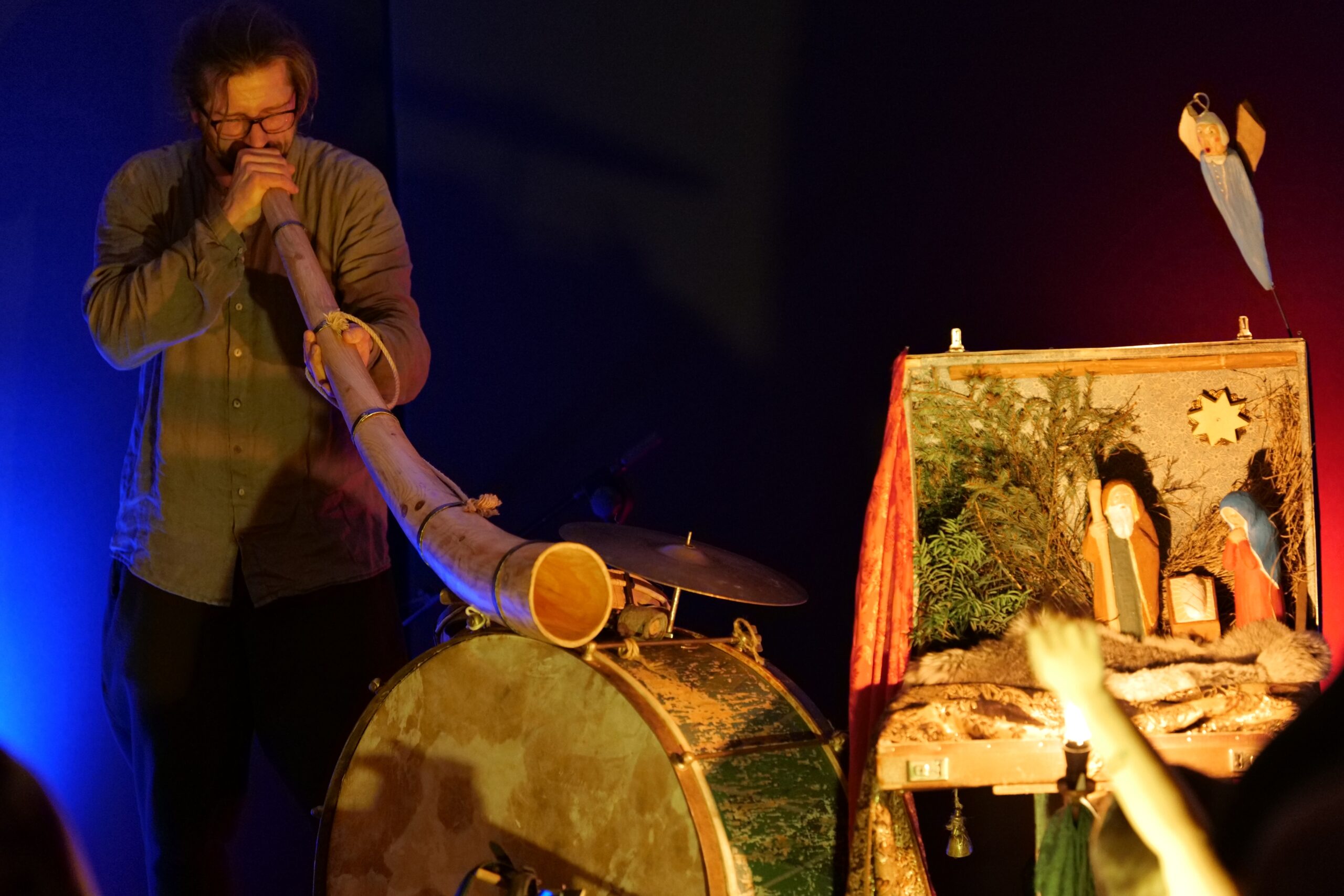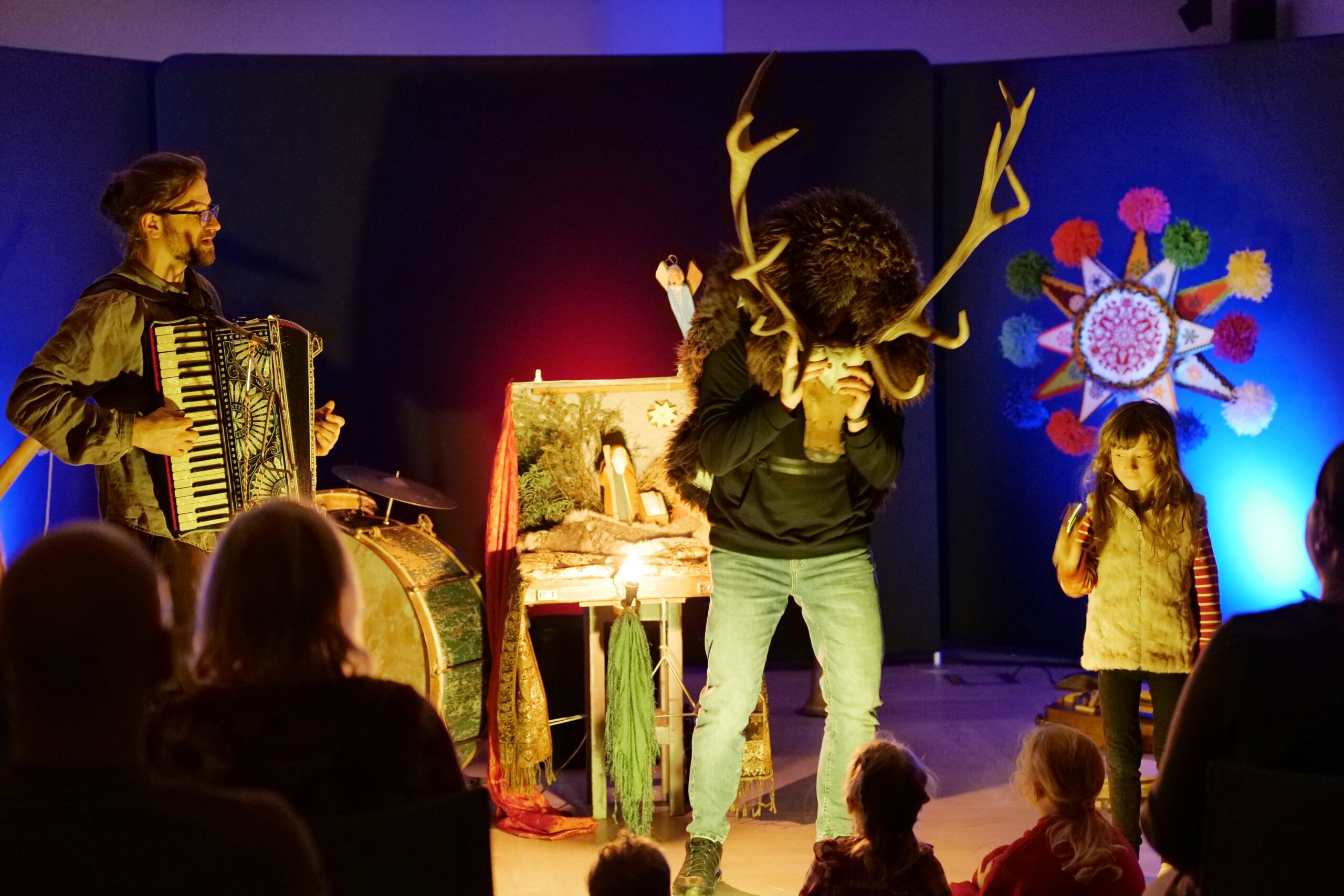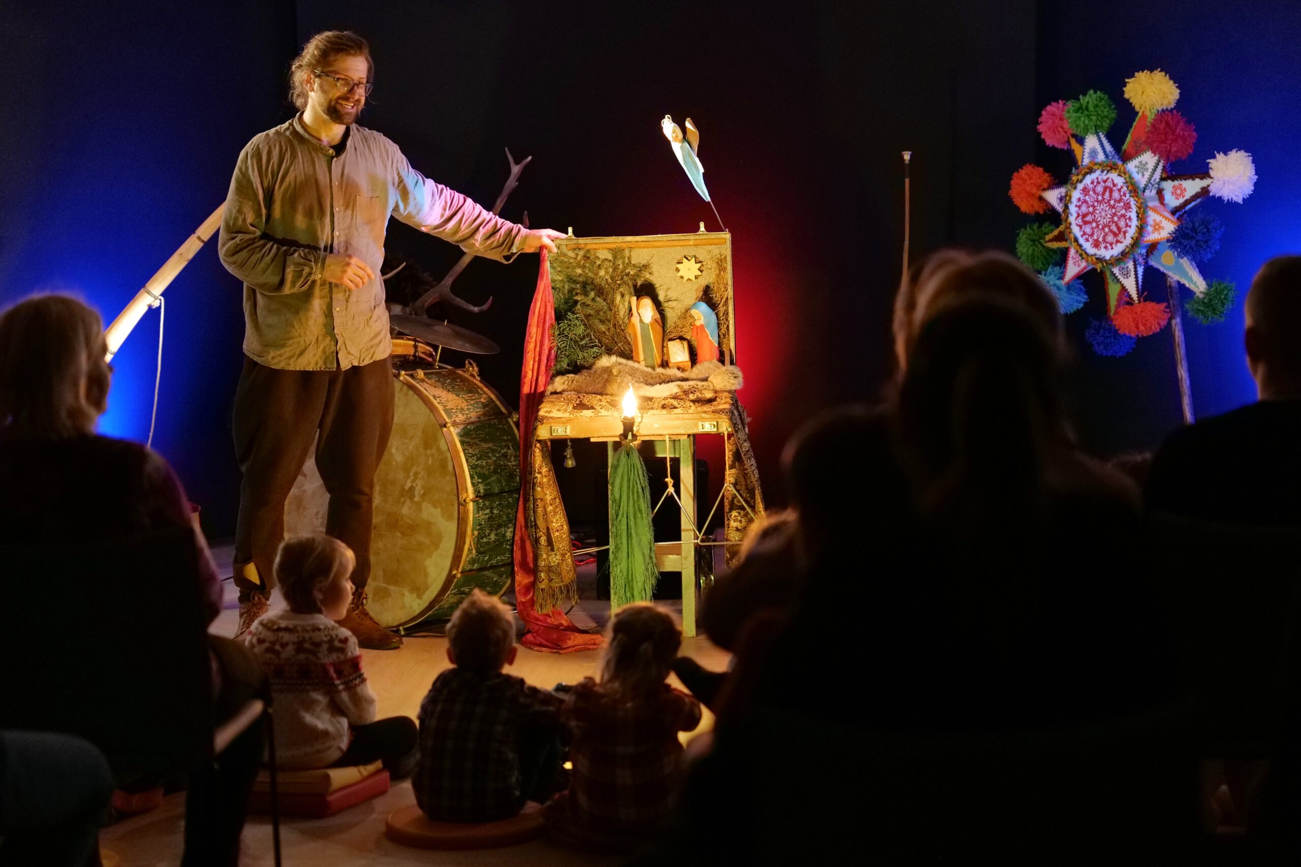 Artyści własnoręcznie wykonali lalki do spektaklu. Powstały ze starych przedmiotów oraz naturalnych materiałów gromadzonych przez twórców od lat. Muzyka w spektaklu wykonywana jest na żywo na tradycyjnych instrumentach: na scenie słychać dźwięki przedwojennego akordeonu, bębenka obręczowego, ręcznie kutego trójkąta oraz różnego rodzaju instrumentów perkusyjnych. Dopełniają je starodawne kantyczki i polskie kolędy śpiewane przez Mateusza Tymurę – aktora i muzykanta.